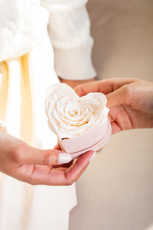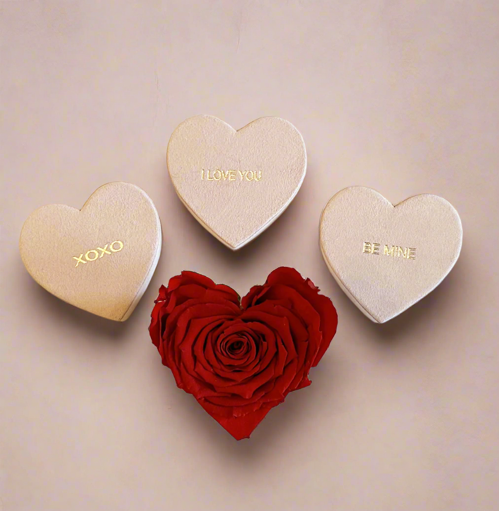 Introducing Our Petite Kardia Box, a charming addition to our Kardia collection. This palm-sized, heart-shaped wonder, complete with a rose that lasts a year, in our pink suede box, is a testament to enduring love. We offer three personalized lid options - "Be Mine," "I Love You," and "XOXO," ensuring your gift resonates deeply with your special someone.